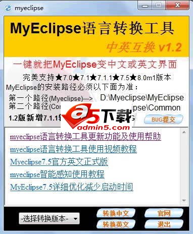 myeclipse语言互换工具v1.4是进行myeclipse英文版进行中英文互换,如果不想使用中文界面,只需点击一下还原就变成英文界面了,在次使用中文界面在点击一下汉化,使用上很方便。目前支持myeclipse7.0,myeclipse7.1,myeclipse7.1.1,myeclipse7.5,myeclipse8.0,myeclipse8.5,myeclipse8.6,myeclipse8.6.1版本。