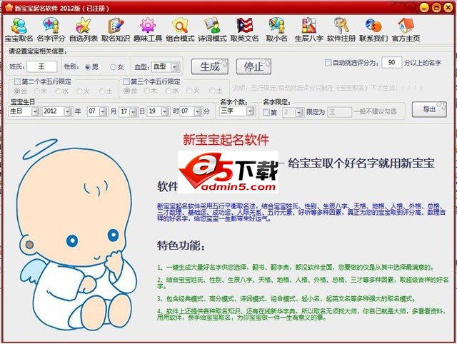 新宝宝起名软件采用五行平衡取名法,结合宝宝姓氏、性别、生辰八字、天格、地格、人格、外格、总格、三才数理、基础运、成功运、人际关系、五行元素、好听等多种因素,真正为您的宝宝取到评分高、数理吉祥的好名字,给您宝宝一生都带来好运气。