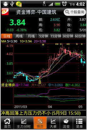 手机L2最全最强大的主力资金功能组,包括三大类:实时资金分析,机构散户博弈分析,主力进出扫描。1)、实时资金分析包括买卖十档,龙虎看盘,分时博弈功能,展现当时资金的进出情况。2)、机构散户博弈分析包括大单比率,资金净流,资金博弈,筹码聚集,超级资金功能,将一段时间内主力资金仓位的变化趋势和力度清晰展现。3)、主力进出扫描包括当日资金流入,5日资金流入,10、20日主力增仓等功能,全面透析市场资金变化情况,选出主力持续关注的潜力股。