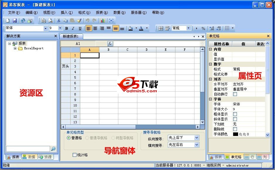 易客报表(ExcelReport)运行在Java环境,采用Excel的习惯来制作动态报表,易学易用,在查询、统计、分析以及软件开发领域有广泛的应用价值。可以实现各类复杂报表,提供丰富的图表、方便的打印功。同时提供填报功能,只要按Excel的习惯制作好模板,发布到网上就可以用网页进行填报。