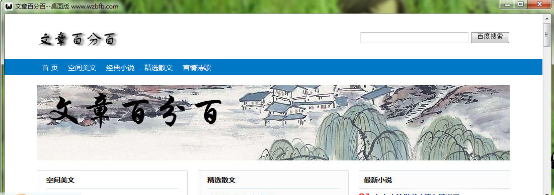 文章百分百是一个以美文为主题的综合文学网站。内含有各种优美哲理文章,优美伤感文章,现代诗歌散文,优美抒情散文,小说.读文章,就用文章百分百桌面版!