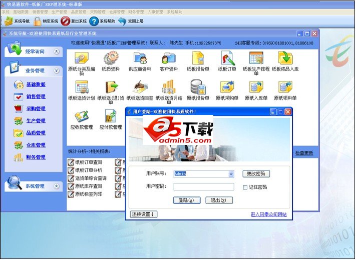 快易通纸板纸箱厂管理软件--快易通纸板/纸箱/彩箱厂集一体的专用管理软件,软件运用微软最新.NET 3.5框架,功能强大,数据稳定,操作简便,技术领先,软件内不同模块窗口可以互相切换,图标任意排序。数据录入智能化提示/索引,不用刻意去记。兼顾整家厂的管理,带有人事管理及辅料仓管理。与生管系统/财务系统无缝连接!支持网上在线自动更新,异地访问公司系统数据,不需增加任何费用!