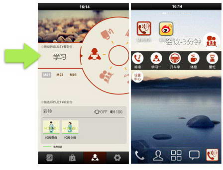 只要滑动转盘就可以设置当前状态相对应的彩铃,如开会、开车、休息等;如将状态设置为开会,那么彩铃将被换为“对不起,您所拨打的用户正在开会,不方便接听您的电话……”;在状态更改的同时,手机会自动切换为相应的情景模式,自动匹配振动或音量(可设置)。当通过手机音量键将音量调至0时,情景音乐会自动切换为默认状态 “繁忙”(可设置)。