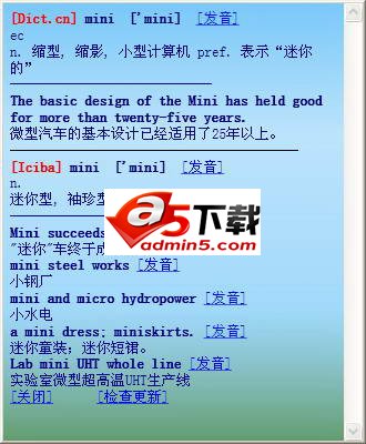 迷你词典是由迷你软件免费提供的一款绿色在线翻译软件。迷你词典集成爱词霸(iciba.com)和海词(dict.cn)两大在线词库,软件采用微软新一代图形系统(wpf)开发,运行在.net framework 4.0架构下。软件主界面只有一个小图标及一个文本框,漂浮在系统桌面,当需要翻译时,只需要将要翻译的词输入或复制至文本框,按下回车便可弹出翻译结果,不影响正常使用电脑,方便易用。