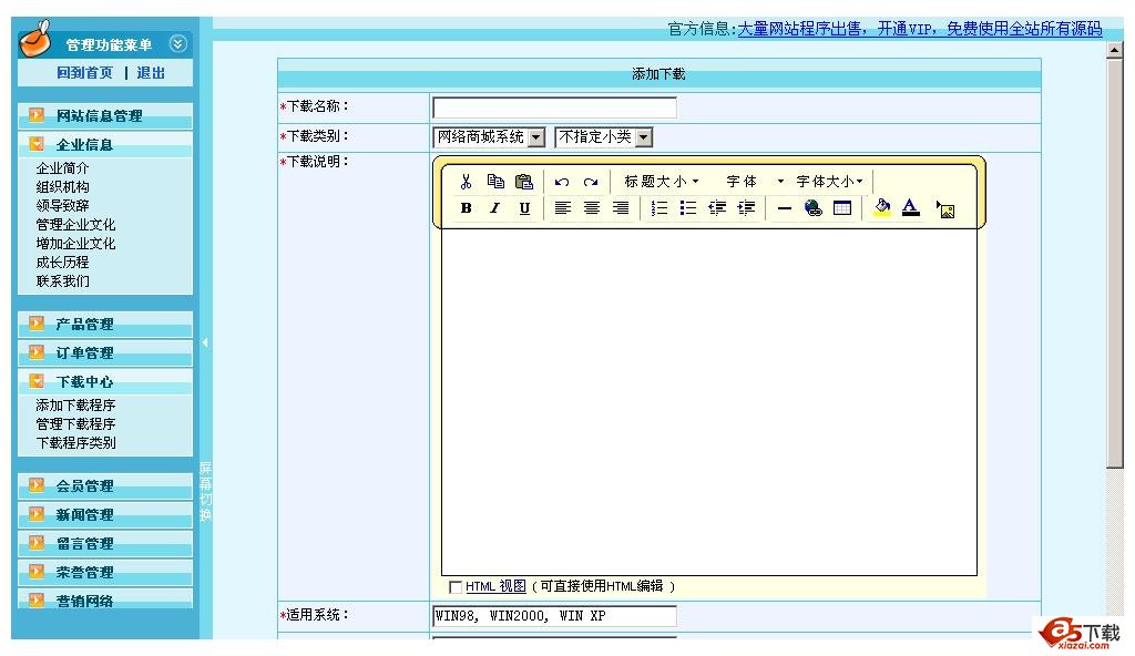 五、下载中心:可分类增加各种文件,如驱动和技术文档等文件的下载。