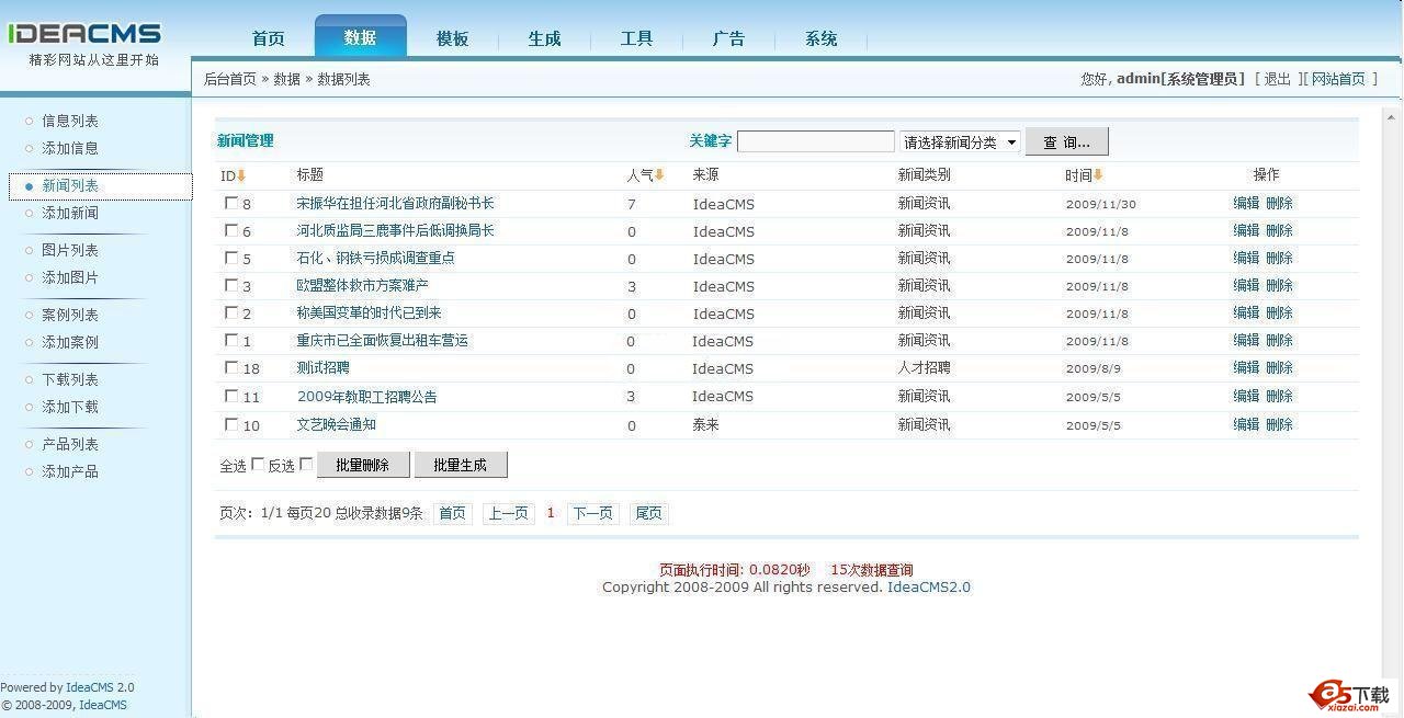 IdeaCMS网站内容管理系统是主要服务于中小企业的CMS内容管理系统,一般的开发人员能够使用系统提供的模块以最低的成本、最少的人力投入在最短的时间内架设一个功能齐全、性能优异的网站平台。