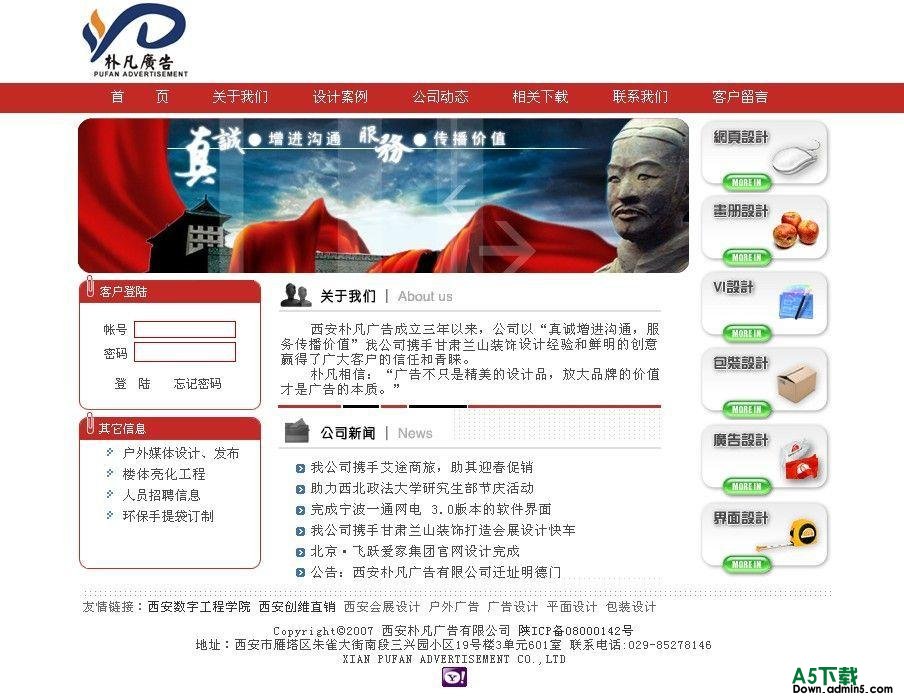西安朴凡广告网站系统 3.0,内置新闻、案例、留言、下载模块。 1.全站可选择生成静态HTML。 2.支持多级栏目。 3.支持文章专题。 4.评论、公告、投票、留言、友情链接、上传文件管理功能。 5.支持网友投稿。 后台地址:login.asp 用户:admin 密码:admin