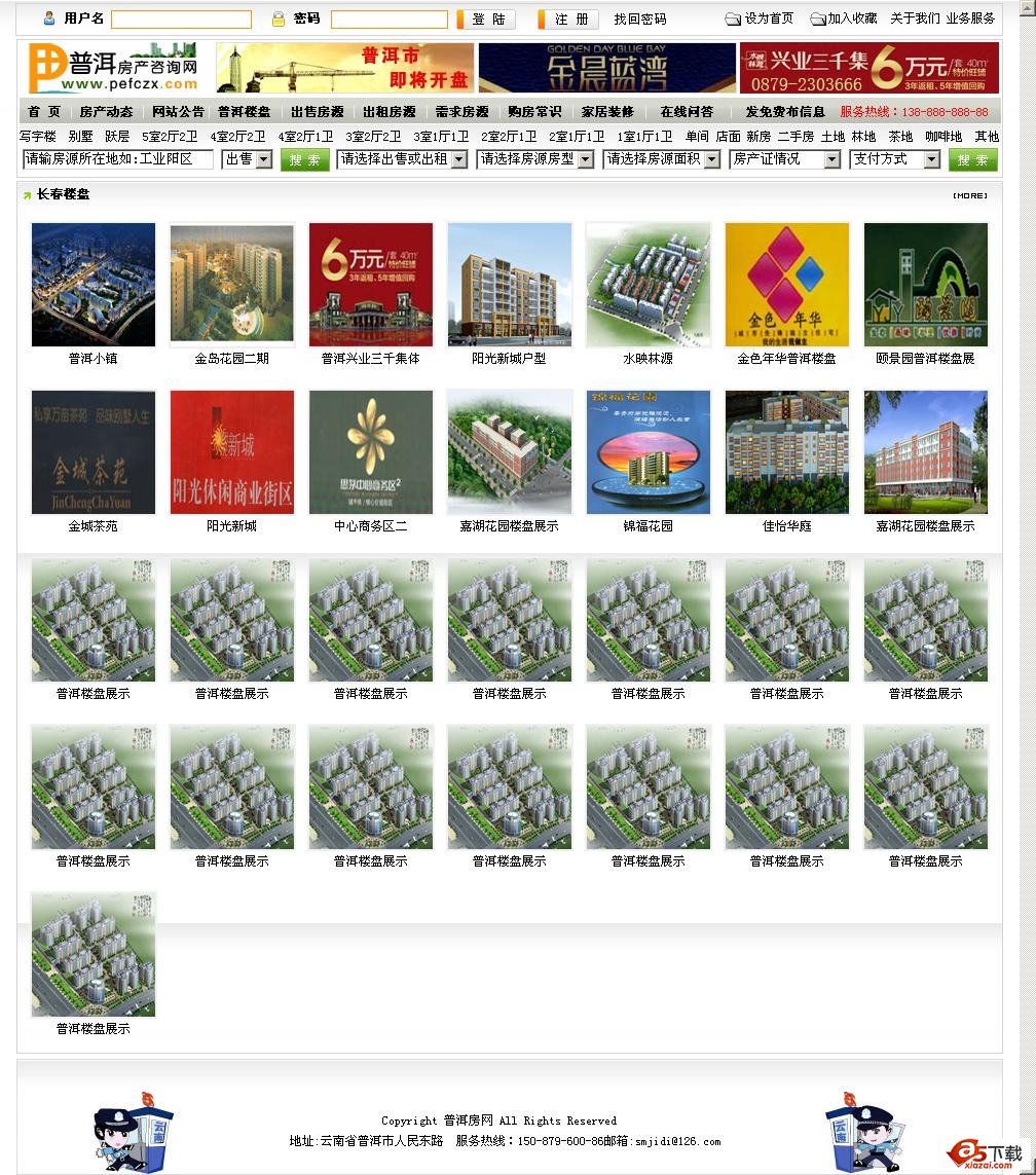 普洱房地产信息网程序主要栏目功能包括房产动态、拍卖公告、普洱楼盘、出售房源、出租房源、需求房源、购房常识、家居装修、在线问答、发免费布信息等。