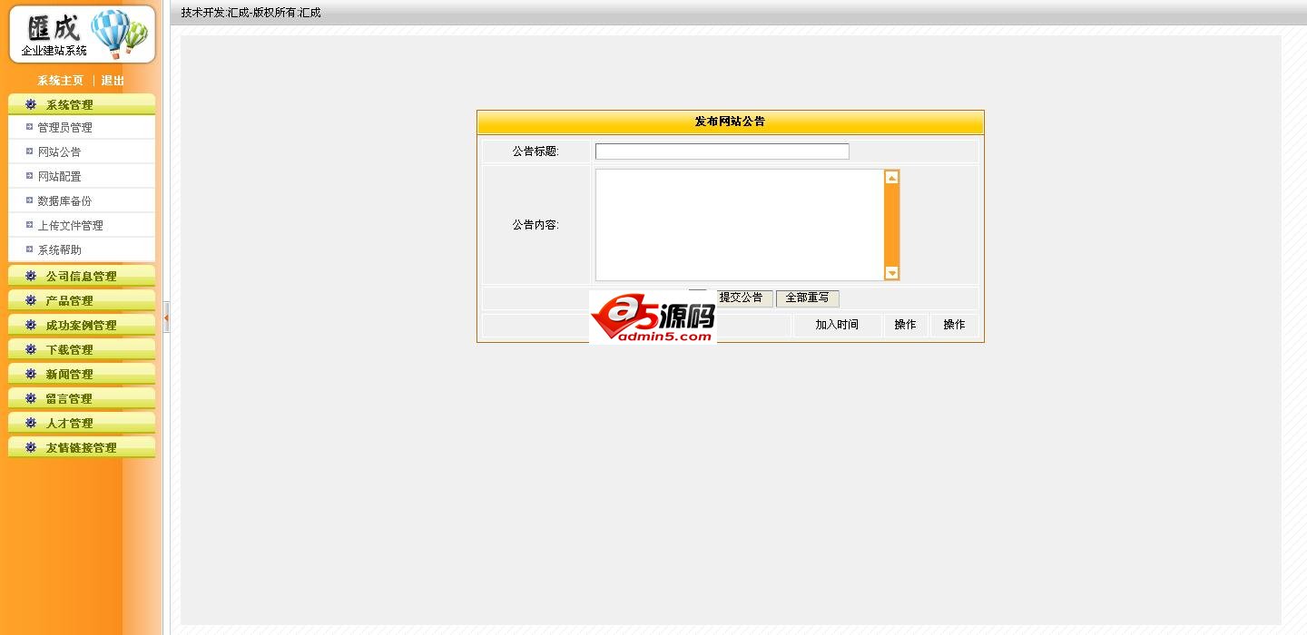 汇成装潢行业企业网站cms系统为中小企业免费建立属于自己的网站,拥有企业网站常用的模块功能:企业简介模块、联系我们模块、新闻(文章)模块、产品模块、图片模块、招聘模块、在线留言、反馈系统、在线交流、友情链接、网站地图、栏目管理、网站碎片、管理员与权限管理等等,所有模块的分类均支持无限级别的分类,可拓展性非常强大。其中包括万能的栏目管理系统、网站碎片管理系统,通过这些系统,可以组合出各种不同的页面和应用。系统带强大灵活的后台管理功能、支持伪静态URL页面功能、自定义Banner、LOGO功能等可为企业打造出大气漂亮且具有营销力的公司网站。