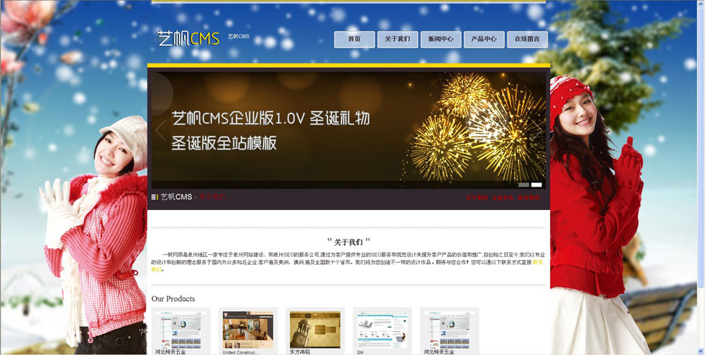 艺帆CMS官方模板_圣诞节网站源码,全站DIV+CSS+JS,制作漂亮大气,大背景图片可以自由更换 大小不限建议:1920*1078 功能上保留了关于我们单页 在线留言 产品 新闻管理等。其它功能和艺帆CMS企业版1.0V一样,全站伪静态,图片可以批量上传,艺帆CMS将推出更多精品网站更加契合WEB2.0~3.0 你还想用那些俗不可耐的网站?还花钱去制作那些俗不可耐的网站? 艺帆CMS 企业版 开源 免费,官方模板与欧美同步,拒绝已经满大街的样式。