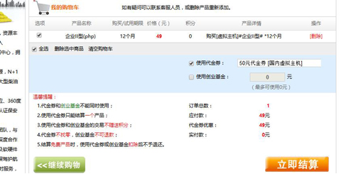 3.勾选订单,选择“使用代金券”,用50元虚拟主机代金券支付即可,免费开通一年。