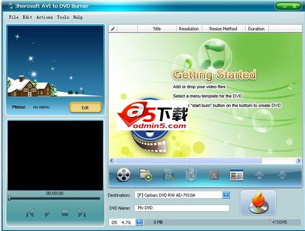 3herosoft AVI to DVD Burner是一个功能强大的视频处理软件,你就可以很容易地转换和处理各种MPEG视频文件,帮助你创造时尚的菜单,菜单模板的背景音乐,图片,菜单,选择你的主题,让你的DVD影片个性化的。