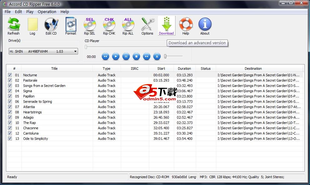 Accord CD Ripper是一款免费CD音轨抓取工具,Accord CD Ripper官方版可以帮助你轻松的将所珍藏的CD唱碟抓取出来并保存为MP3等音频文件格式。