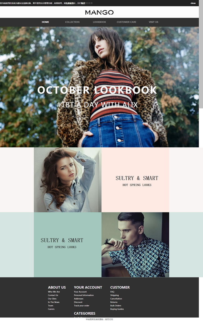 欧美风格时尚潮流的服饰用品网站模板,英文界面,简洁大气,适合欧美品牌服饰企业使用,建站宝盒制作。