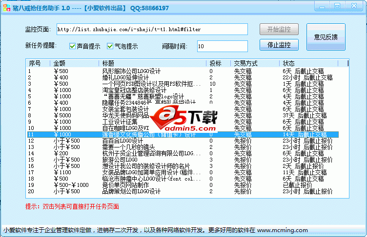 猪八戒抢任务助手让你第一时间就知道有新任务,并且发现任务的时候有气泡提醒以及铃声提醒。助你在最快的速度抢到新任务。