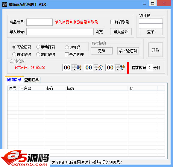 猎鹰京东抢购助手能批量导入多账号,帮助您成功抢购商品。还有定时功能,让您解放双手,抢购无忧。 本软件还加入了UU远程打码功能!支持更换代理IP! 绿色小软件,大家放心使用!