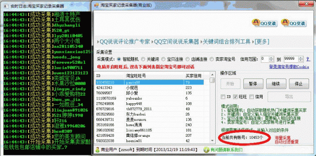 推广 的工具,实现对淘宝卖家/店铺/宝贝进行批量采集淘宝买家旺旺号并加以利用营销推广,支持导出进行 二次利用!是淘宝营销和数据分析的必备利器!新版更增加支持:智能随机、指定宝贝关键词、指定宝贝连接、指定店铺连接、指定卖家淘宝旺旺号进 行采集同时支持淘宝和天猫,支持自动挂机(自动保存到文档)