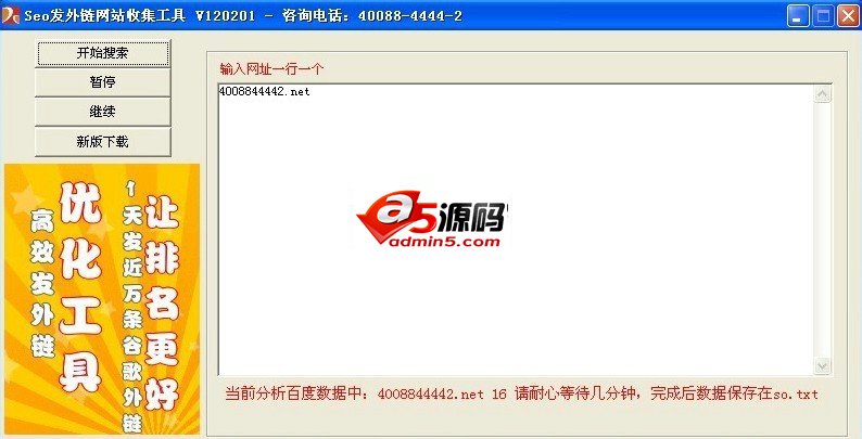 Seo发外链网站收集工具 V120201可以快速分析并收集整理百度、sogou、雅虎三大搜索引擎里面当前网站的所有外链网址,是Seo外链类站长工具软件或外链类网站的必备软件,再也不用一个网站一个网站整理收集,只需批量替换即OK,部份国内杀毒软件如误报病毒请设置成安全、允许、或暂时关闭杀毒软件、或删除杀毒软件,请放心使用绝对没有病毒,本软件由广州欣诚计算机科技有限公司开发并免费提供。