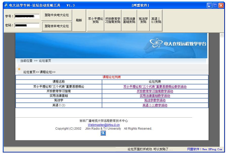 电大论坛自动发贴软件用于电大法学专科每天论坛自动发贴,每个贴子内容都不相同,随机生成发贴内容。天天发贴、天天赚学分!