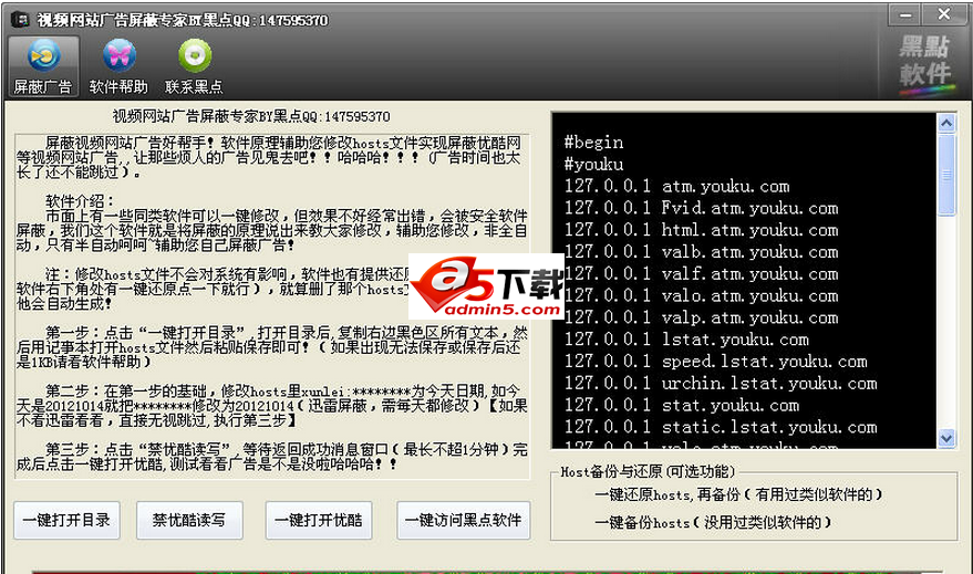 视频网站广告屏蔽专家,屏蔽视频网站广告好帮手!软件原理辅助您修改hosts文件实现屏蔽优酷网等视频网站广告,,让那些烦人的广告见鬼去吧!!哈哈哈!!!(广告时间也太长了还不能跳过)。
