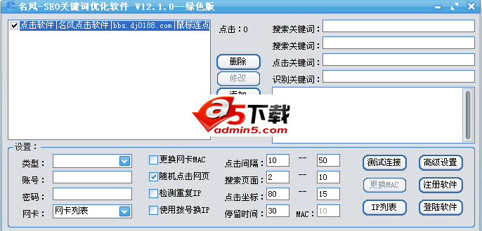 名风seo关键词优化软件,它是对搜索引擎进行模拟化人工操作的一款强大seo工具,通过拨号换IP和更换网卡MAC地址,全自动模拟手工在搜索引擎中搜索关键词。从而达到提升关键词排名的效果。软件内置adsl拔号自动换ip,多关键词轮流搜索点击、关键词2次搜索、时间段点击设置、2次客户网站页面随机点击、随机间隔等智能化操作设置。