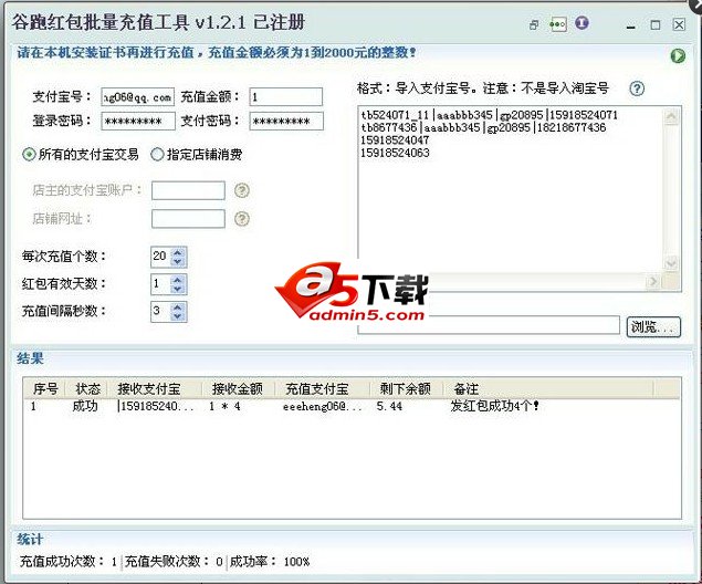 1、可安装数字证书后发红包 2、可设置充值时间间隔 3、可设置红包的有效期,默认有效期是1天 4、充值速度可以提高20倍 5、可指定店铺消费,增加资金的安全性帐号格式:是导入支付宝直接充值(总之一行要有一个支付宝号就可以的了),不是导入淘宝号。 如:淘宝用户名|淘宝密码|支付密码|支付宝帐号(一行一个号) 或者直接用 支付宝帐号(一行一个号)