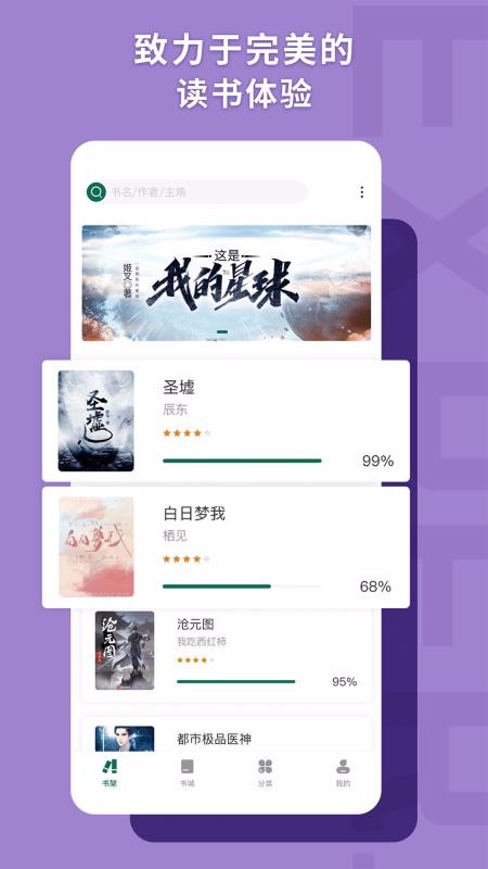 6、清晰的书架书籍阅读进度,上面的书籍以列表形式展示并显示其阅读进度参数;