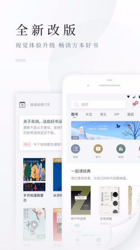 3、进入首页可以使用搜索功能,点击图书、男生、女生、VIP等各个部分下的小说资源进入阅读模式等