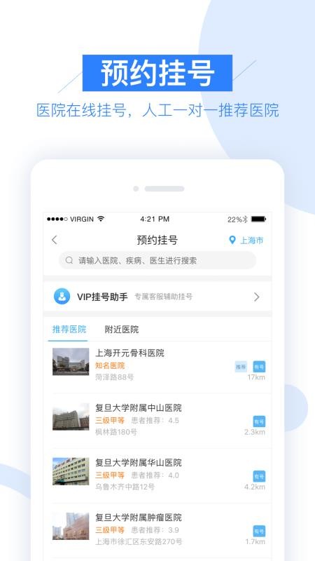 2、轻松在线了解本地附近的医院和全国优质的医院信息,轻松在线挂号;