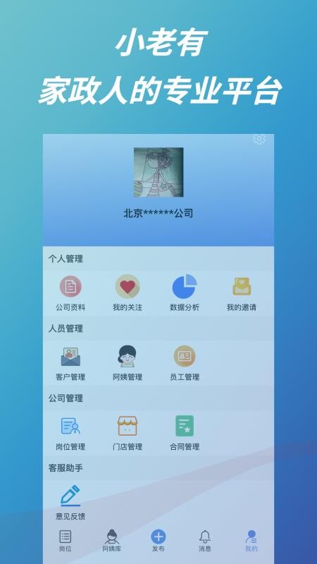 小老有商户助手app是一款为家政商户提供各种管理服务的软件,让用户能够更加轻松的管理公司,快速获取更多的客户;用户在软件中能够快速匹配各种各样的家政服务需求信息,从而更加高效的派单,轻松拥有更多的收益,并且用户可以在这里更加便捷的进行人员管理工作,了解各个人员的工作情况,掌握各个客户的家政服务需求,同时用户能够快速发布各种各样的信息,从而轻松招聘更多的优秀家政服务人员,为自己的公司经营带来更多的便利;快下载这款软件试试吧,更加高效的管理公司,轻松拥有更多家政收益。