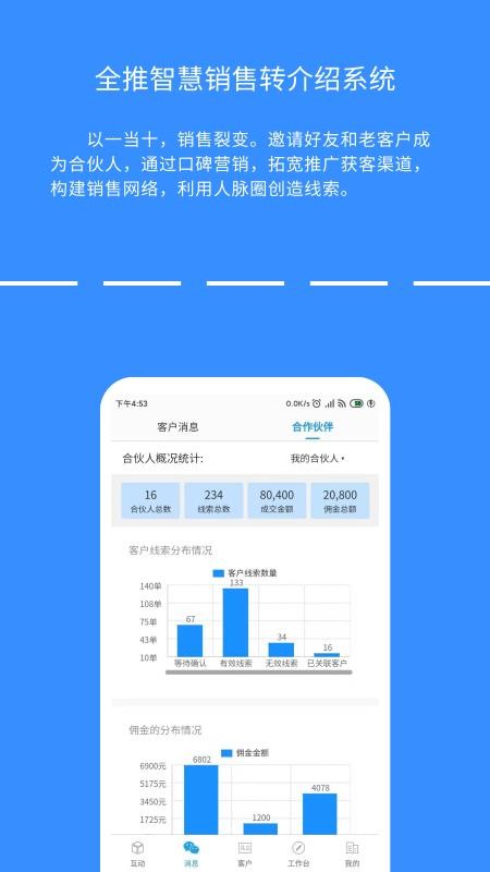 4、用户在软件中能够清晰看到各个合伙人的推广次数、线索数量和佣金详情;