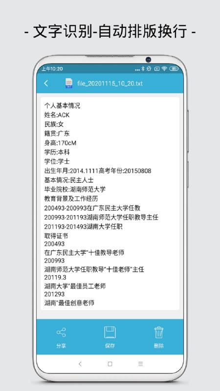 3、文字识别,对于扫描的内容进行文字识别,自动的排版换行;