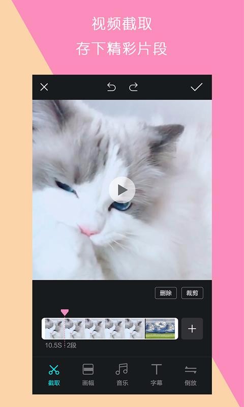 4、进入编辑页面,点击截取、画幅、音乐、字幕等