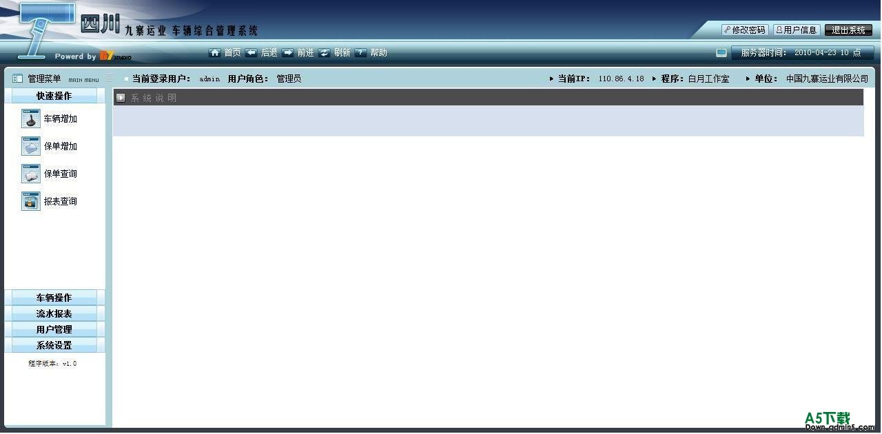 本系统是为四川九寨运业所定制的车辆保险管理与报表管理系统。 其主要的功能是对车辆的管理与保险的管理: 车辆管理: 1、车辆的增加编辑与修改,以及承包和驾驶员信息 2、车辆的报废(删除) 保险管理: 1、针对车辆的保险增加 2、针对车辆的保险编辑和修改 3、保险报表 用户管理: 1、简单的用户管理,单级权限