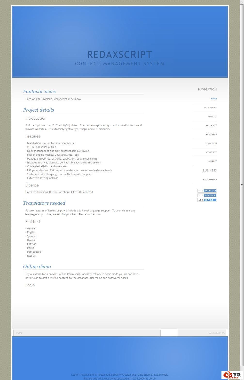 Redaxscript是一个免费的基于 PHP 和MySQL 的内容管理系统,主要用于小型企业和私人建站使用,它是一个极其轻量级,简单可定制的内容管理系统。