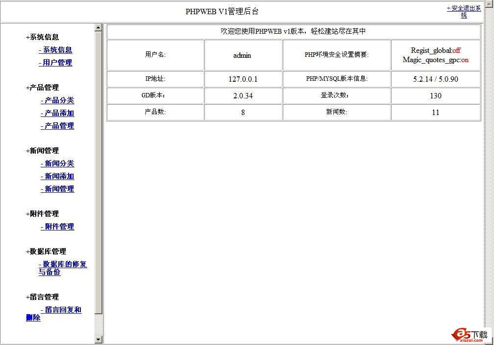 phpweb企业管理系统基于php+mysql+smarty+ajax技术,使用更加方便,用户体验更加良好。本系统包括产品管理系统,文章管理系统,附件管理系统,以及数据库的管理及维护,ajax留言系统,界面简洁大方,后台操作更加方便。对多项操作有特别好的支持,无论是多项删除以及多项分类。数据库管理更加简便,修复表,备份和还原表,采用分卷备份及还原更好的提高了速度。 后台地址root/login.php 用户名密码admin