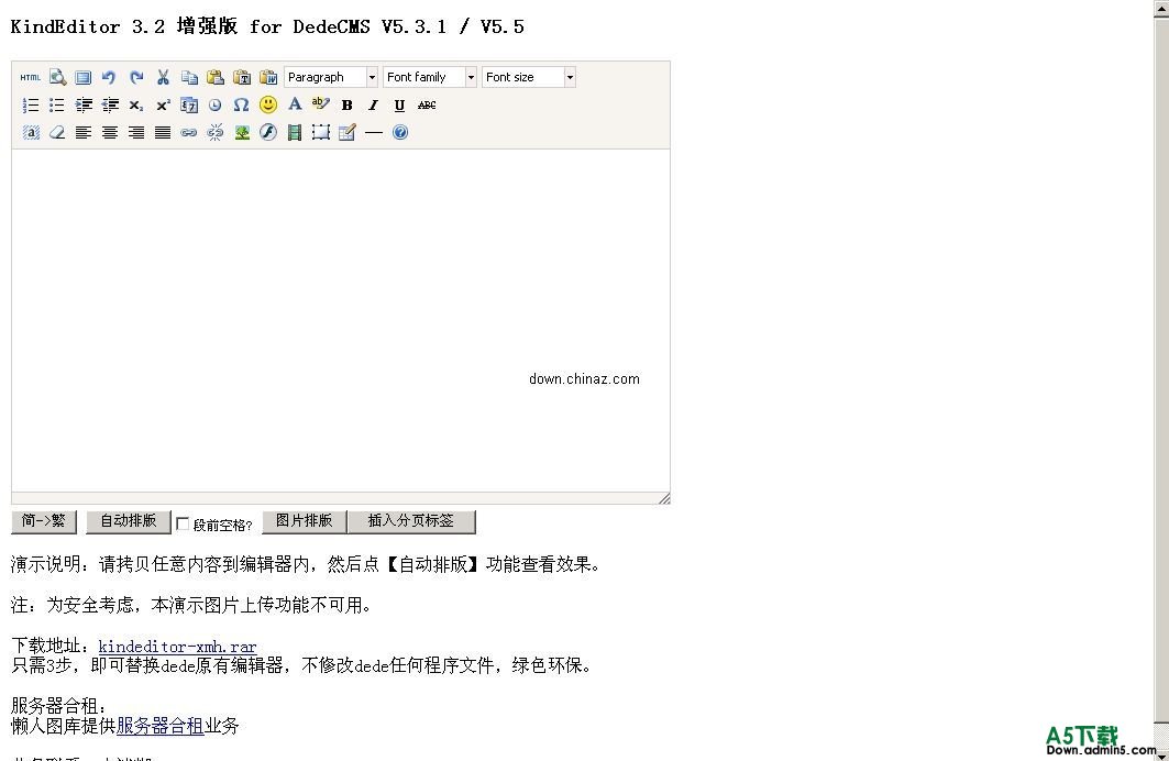 1、自动排版,将编辑器内的内容自动排版,段落自动居左,图片自动居中,清除多余空行,可定制段前是否空格。 2、图片排版,将编辑器中的图片自动居中,免去每张单独设置的烦恼。 3、简繁转换,可在编辑器中直接进行简繁转换,一键操作,方便快捷。 4、自动排版后,代码里只保留段落标签,粗体标签,(会被自动替换成),垃圾代码自动过滤,保证了代码的整洁。