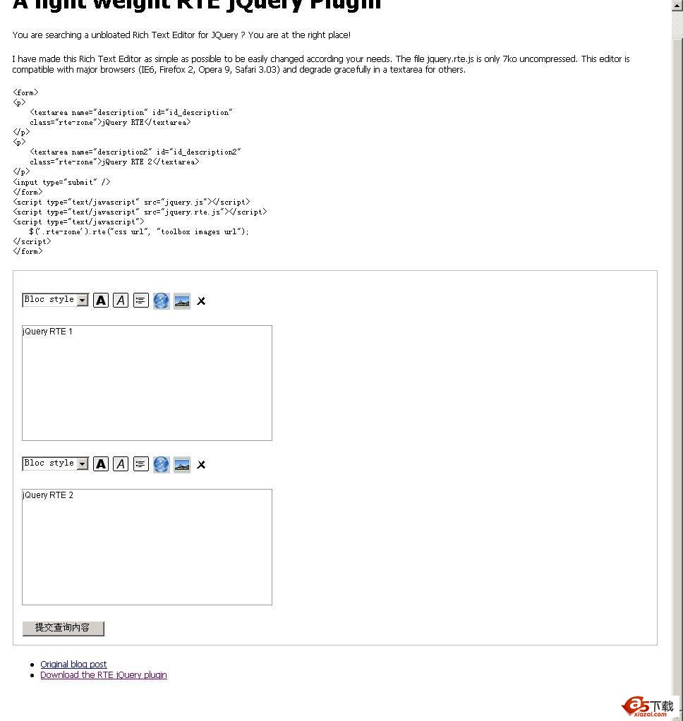 编辑器同样非常小而且易用,并可根据需要进行定制,jquery.rte.js 文件只有 7k (未压缩),兼容主流浏览器 (IE6, Firefox 2, Opera 9, Safari 3.03)