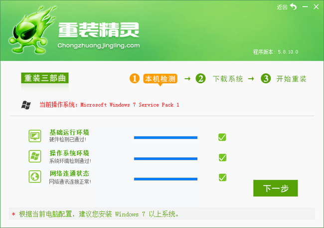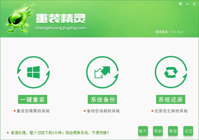 1、点击下载软件,并正常打开,点击软件主界面的"一键重装"按钮进入"下一步",如果你本机中已经有过GHO镜像文件,则可以用第三步的"系统还原"来还原您之前的电脑配置!