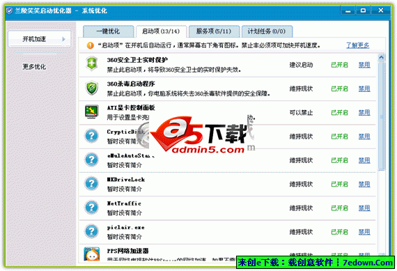 兰陵笑笑启动优化器是一款用于Window启动程序优化的小工具。提供了对Windows启动项,Windows系统服务器项以及Windows计划任务的一键优化,智能分析等功能。完全绿色免费软件。 基于金山卫士开发。