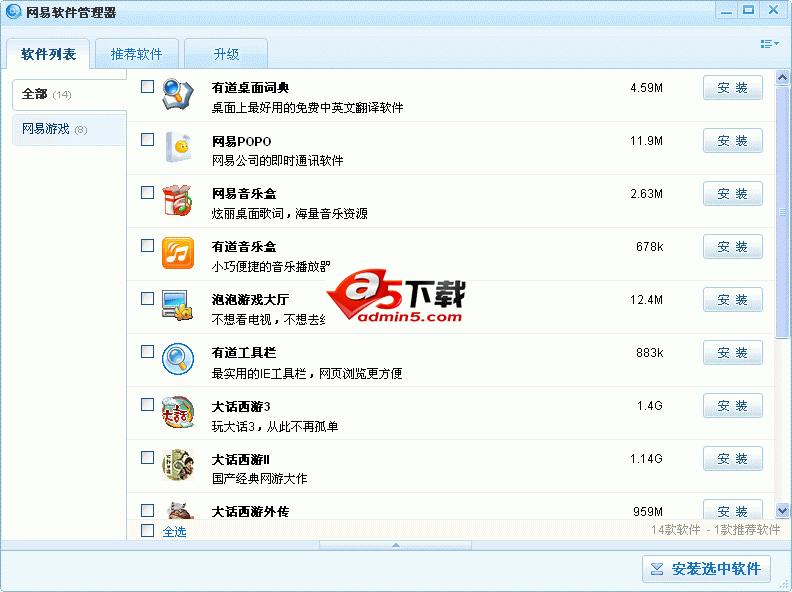 网易软件管理器可简化互联网用户下载、安装及管理软件的过程,让用户更加便捷、安全地使用常用软件。目前网易软件管理器中包含了网易旗下的多款游戏和软件。