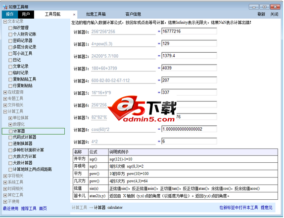 --计算器:写公式计算,比如1+5*3,并能保存计算值,带有平方、立方、阶乘、三角函数等,同时可以算10个结果。