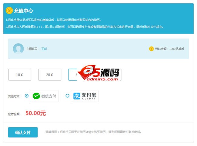基于amazeui用户充值页面特效是一款可以选择支付宝或者是微信的付款方式来进行充值。