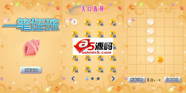 一笔连珠HTML5小游戏是一款用手点击每个圆珠原点来让线段进行连接,但是已经点亮的线段不可以重复连接,直到你把所有的线段都点亮即是闯关成功。