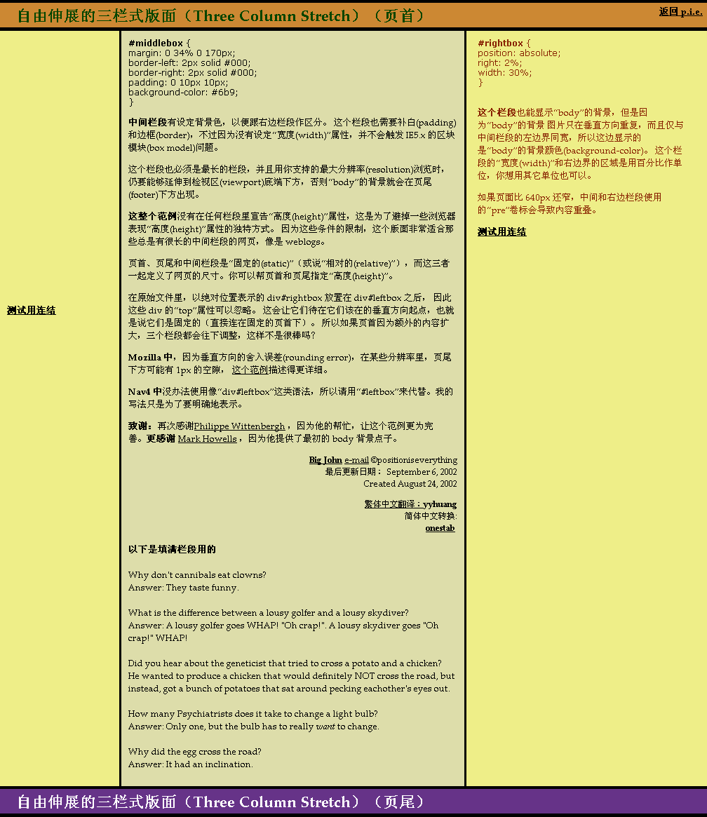 自由伸展的三栏式版面,div布局,非绝对定位,IE,FireFox都OK.
